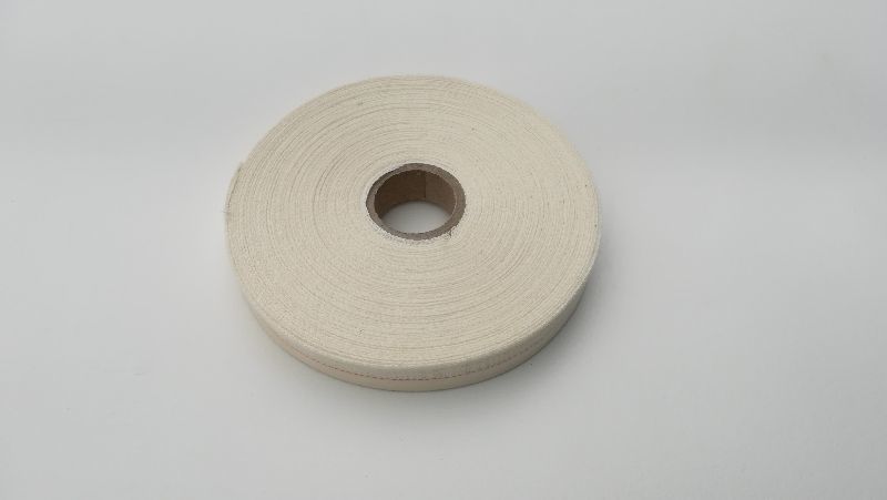 Bande de tissu coton blanc avec un guide centrale rouge au centre. 13 mm x 50 m